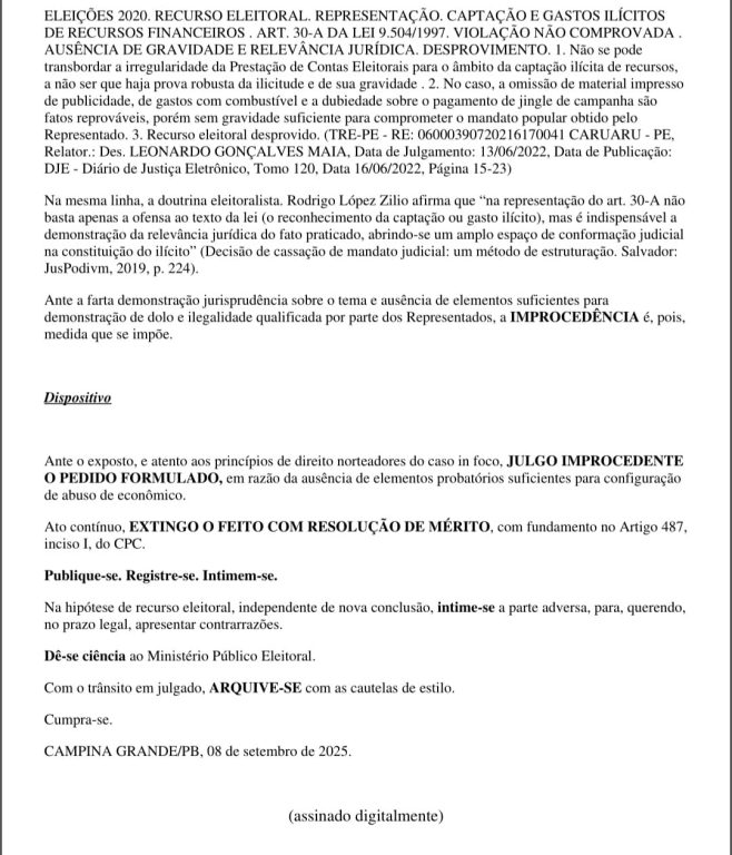 Para a Justiça, as falhas apontadas tinham natureza técnica e burocrática, sem impacto real no resultado eleitoral. O magistrado também frisou que, conforme jurisprudência do Tribunal Superior Eleitoral (TSE), “irregularidades contábeis isoladas não são suficientes para caracterizar abuso, sendo necessário comprovar impacto direto na igualdade da disputa”.
