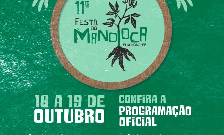 A Prefeitura de Puxinanã divulgou a programação oficial da 11ª edição da tradicional Festa da Mandioca, que acontecerá de 16 a 19 de outubro. O evento promete ser um dos maiores já realizados, reunindo shows, palestras, apresentações culturais, concursos, oficinas e atividades voltadas para a agricultura familiar, turismo e economia local.